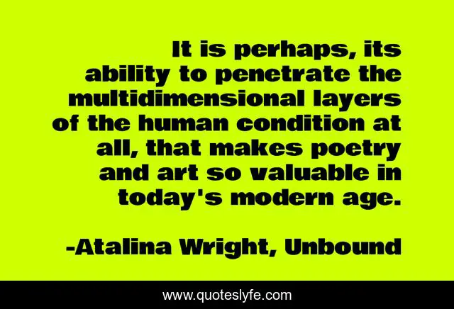 This page presents the quote "It is perhaps, its ability to penetrate the multidimensional layers of the human condition at all, that makes poetry and art so valuable in today's modern age.". Author of this quote is Atalina Wright, Unbound. This quote is about quote, art, poetry, inspirational, enthusiasm,.