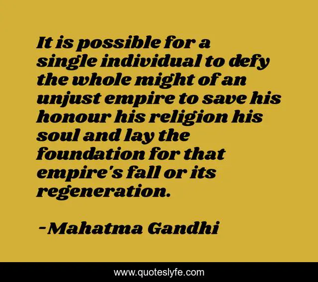 This page presents the quote "It is possible for a single individual to defy the whole might of an unjust empire to save his honour his religion his soul and lay the foundation for that empire's fall or its regeneration.". Author of this quote is Mahatma Gandhi. This quote is about revolution, reform,.