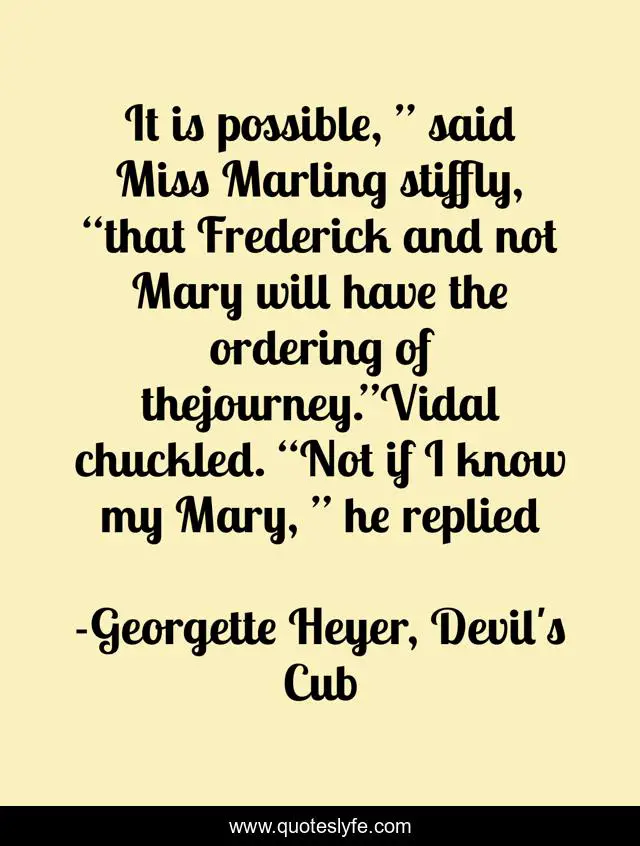 This page presents the quote "It is possible, ” said Miss Marling stiffly, “that Frederick and not Mary will have the ordering of thejourney.”Vidal chuckled. “Not if I know my Mary, ” he replied". Author of this quote is Georgette Heyer, Devil's Cub. .