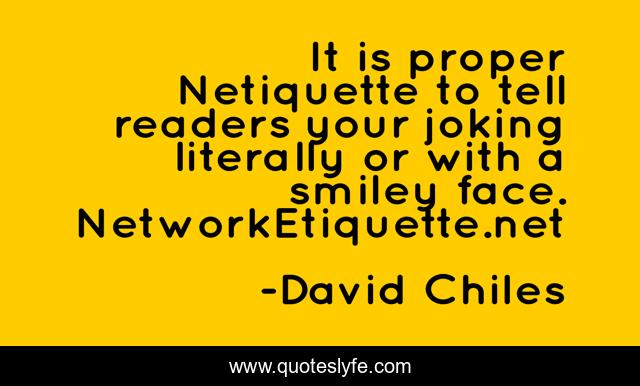 This page presents the quote "It is proper Netiquette to tell readers your joking literally or with a smiley face. NetworkEtiquette.net". Author of this quote is David Chiles. This quote is about social-media, smiley-face, internet-etiquette, smiley, netiquette, network-etiquette,.