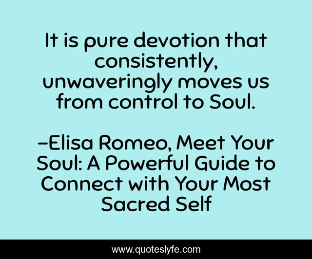 This page presents the quote "It is pure devotion that consistently, unwaveringly moves us from control to Soul.". Author of this quote is Elisa Romeo, Meet Your Soul: A Powerful Guide to Connect with Your Most Sacred Self. This quote is about spirituality, soul, spiritual-wisdom,.