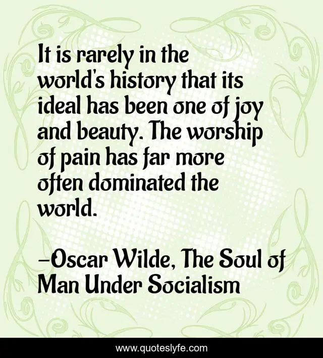 This page presents the quote "It is rarely in the world's history that its ideal has been one of joy and beauty. The worship of pain has far more often dominated the world.". Author of this quote is Oscar Wilde, The Soul of Man Under Socialism. This quote is about pain, worship, beauty,.