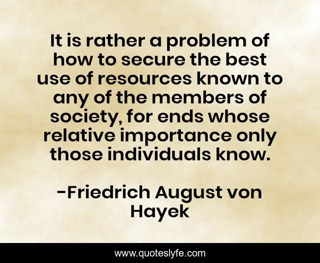 This page presents the quote "It is rather a problem of how to secure the best use of resources known to any of the members of society, for ends whose relative importance only those individuals know.". Author of this quote is Friedrich August von Hayek. This quote is about problem, best,.