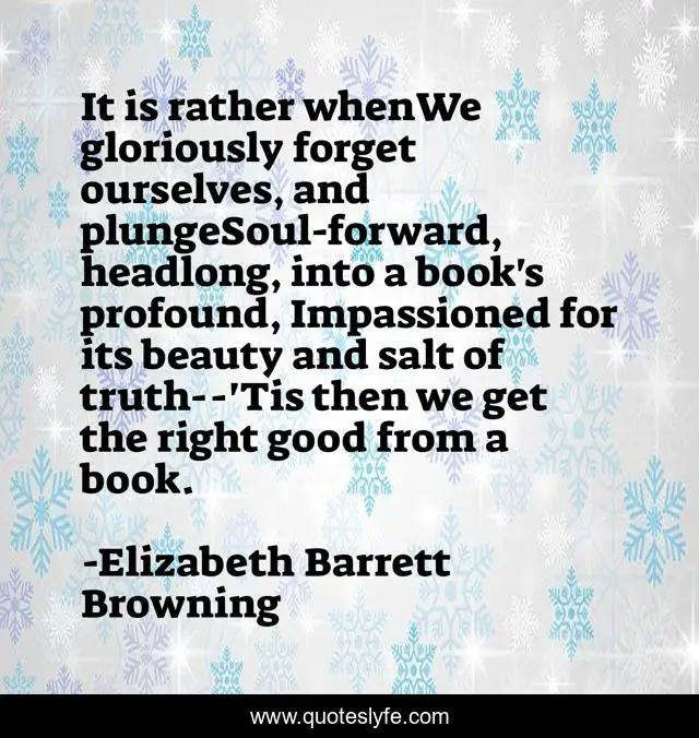 This page presents the quote "It is rather whenWe gloriously forget ourselves, and plungeSoul-forward, headlong, into a book's profound, Impassioned for its beauty and salt of truth--'Tis then we get the right good from a book.". Author of this quote is Elizabeth Barrett Browning. This quote is about books, reading,.
