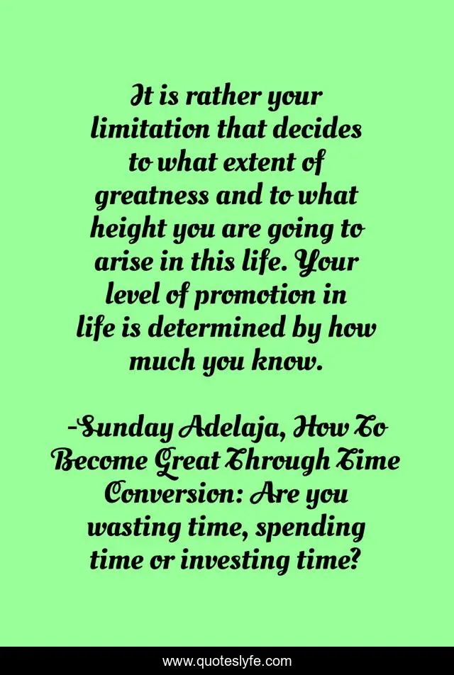 This page presents the quote "It is rather your limitation that decides to what extent of greatness and to what height you are going to arise in this life. Your level of promotion in life is determined by how much you know.". Author of this quote is Sunday Adelaja, How To Become Great Through Time Conversion: Are you wasting time, spending time or investing time?. This quote is about life, conversion, productivity, knowledge, decision, greatness, waste, humanity, limitations,.