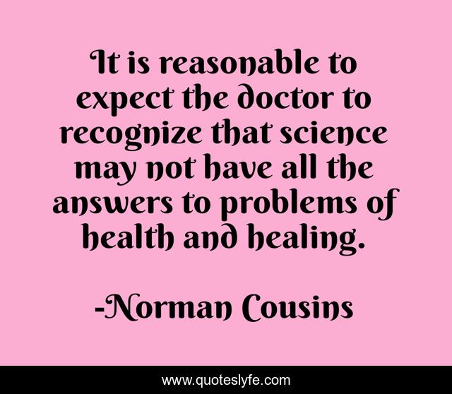This page presents the quote "It is reasonable to expect the doctor to recognize that science may not have all the answers to problems of health and healing.". Author of this quote is Norman Cousins. This quote is about science, health, healing,.