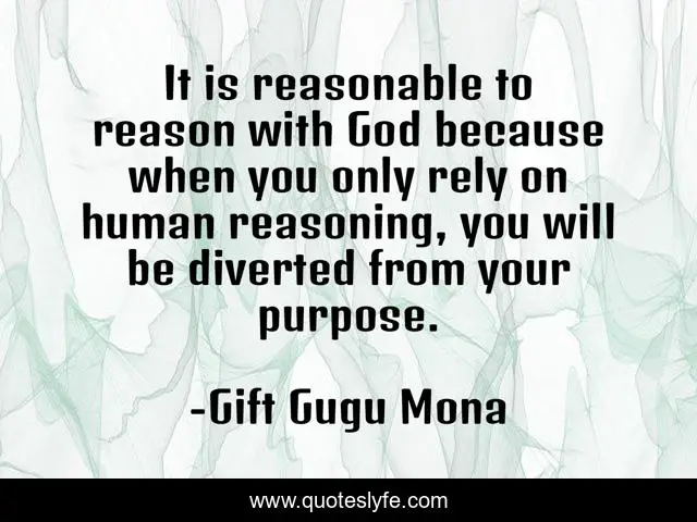 This page presents the quote "It is reasonable to reason with God because when you only rely on human reasoning, you will be diverted from your purpose.". Author of this quote is Gift Gugu Mona. This quote is about human, purpose, reasonable, reason-with-god, purpose-of-life, reasoning, diverted,.