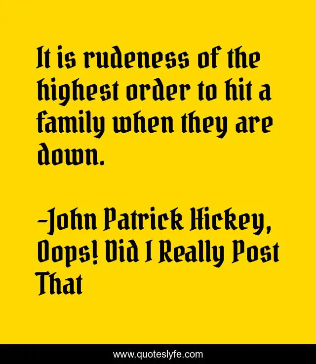 This page presents the quote "It is rudeness of the highest order to hit a family when they are down.". Author of this quote is John Patrick Hickey, Oops! Did I Really Post That. This quote is about etiquette, social-media, success, civility, manners, personal-development, kindness,.