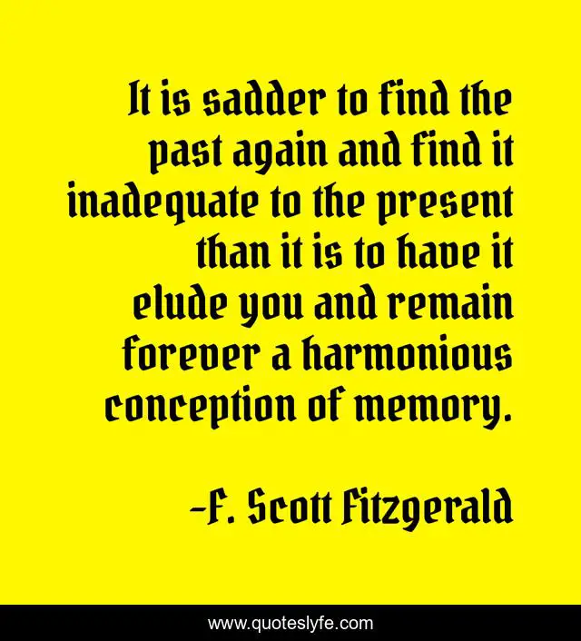 This page presents the quote "It is sadder to find the past again and find it inadequate to the present than it is to have it elude you and remain forever a harmonious conception of memory.". Author of this quote is F. Scott Fitzgerald. This quote is about f-scott-fitzgerald, memory,.