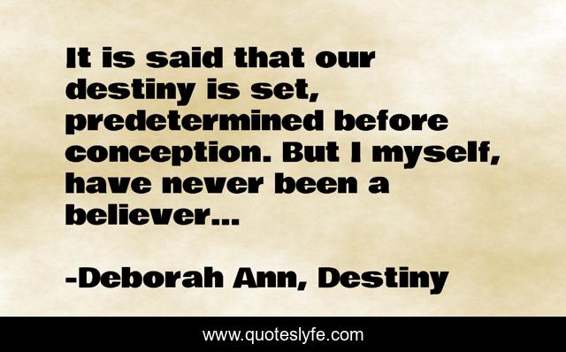 This page presents the quote "It is said that our destiny is set, predetermined before conception. But I myself, have never been a believer…". Author of this quote is Deborah Ann, Destiny. This quote is about series, fairytale, young-adult-romance, first-love, paranormal,.