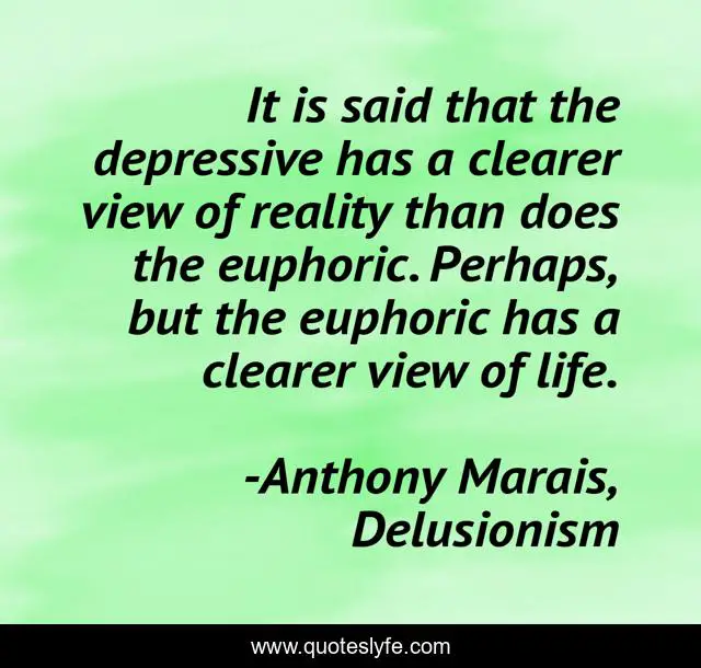 This page presents the quote "It is said that the depressive has a clearer view of reality than does the euphoric. Perhaps, but the euphoric has a clearer view of life.". Author of this quote is Anthony Marais, Delusionism. .