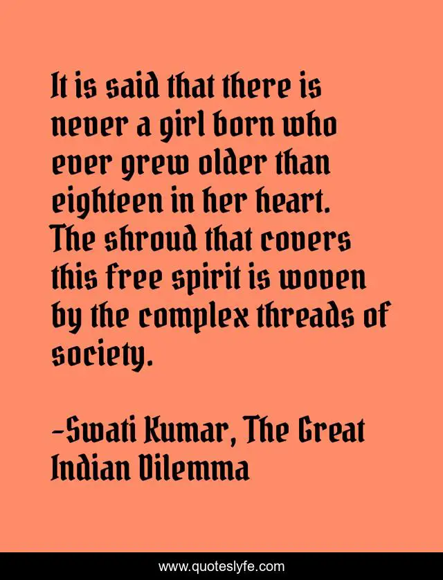 This page presents the quote "It is said that there is never a girl born who ever grew older than eighteen in her heart. The shroud that covers this free spirit is woven by the complex threads of society.". Author of this quote is Swati Kumar, The Great Indian Dilemma. This quote is about society, arranged-marriages, girls, commitment, fiction,.