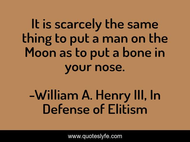 This page presents the quote "It is scarcely the same thing to put a man on the Moon as to put a bone in your nose.". Author of this quote is William A. Henry III, In Defense of Elitism. This quote is about equality, racial-pride, affirmative-action, oppression, racism, elitism, political-correctness, diversity, multiculturalism,.