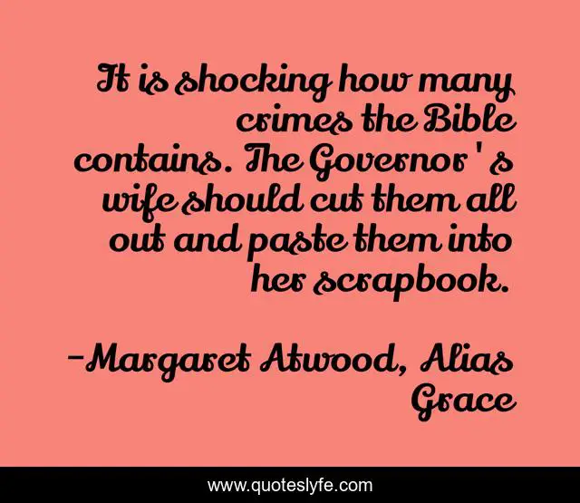 This page presents the quote "It is shocking how many crimes the Bible contains. The Governor's wife should cut them all out and paste them into her scrapbook.". Author of this quote is Margaret Atwood, Alias Grace. This quote is about scrapbook, bible, crime,.