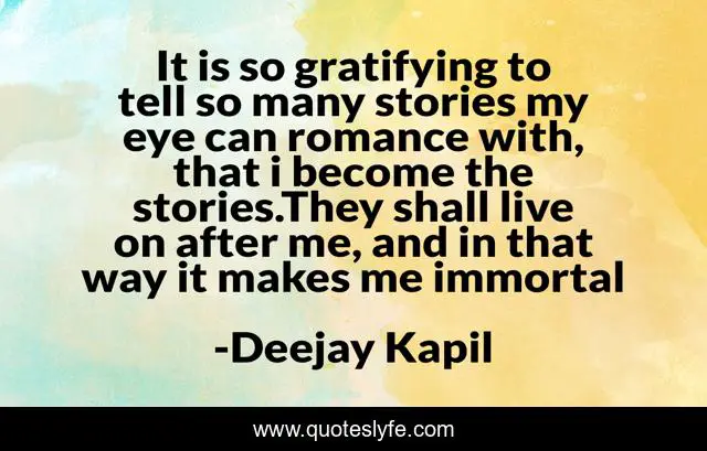 This page presents the quote "It is so gratifying to tell so many stories my eye can romance with, that i become the stories.They shall live on after me, and in that way it makes me immortal". Author of this quote is Deejay Kapil. This quote is about wanderlust, life, explorer, photography, avgeek, explore, stories, adventure, travel,.