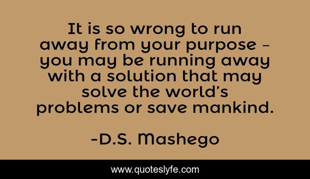 This page presents the quote "It is so wrong to run away from your purpose – you may be running away with a solution that may solve the world’s problems or save mankind.". Author of this quote is D.S. Mashego. This quote is about motivation, mankind, problems, solution, solve, purpose, world, save, inspiration,.