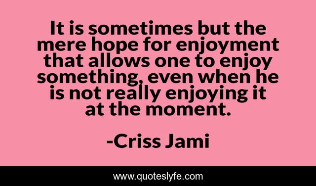 This page presents the quote "It is sometimes but the mere hope for enjoyment that allows one to enjoy something, even when he is not really enjoying it at the moment.". Author of this quote is Criss Jami. This quote is about activities, anticipation, enjoyment, expectation, future, fun, tolerance, hope,.