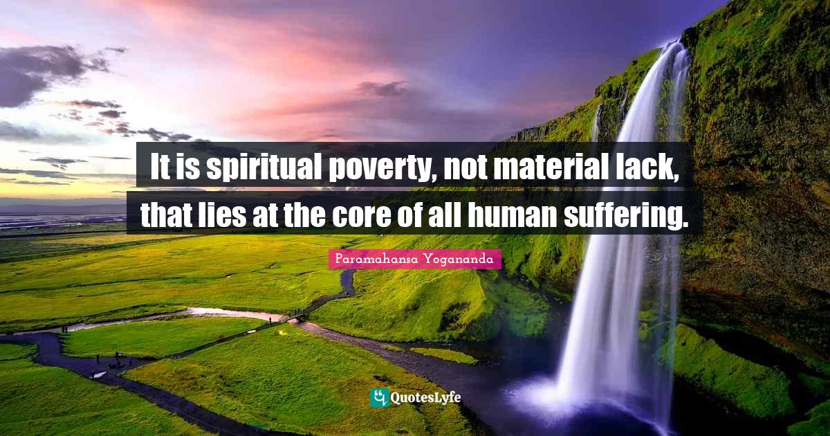 This page presents the quote "It is spiritual poverty, not material lack, that lies at the core of all human suffering.". Author of this quote is Paramahansa Yogananda. This quote is about human suffering, poverty, spiritual, lying, suffering, core,.