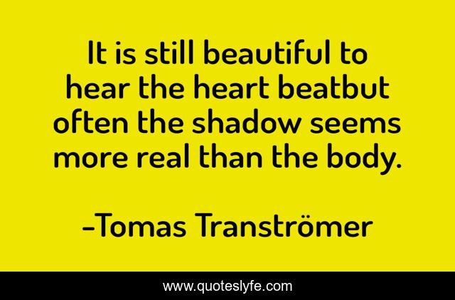 This page presents the quote "It is still beautiful to hear the heart beatbut often the shadow seems more real than the body.". Author of this quote is Tomas Tranströmer. This quote is about hearts, breathing, beauty, living,.