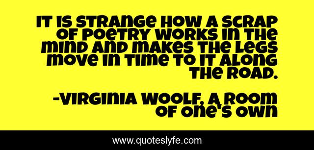 This page presents the quote "It is strange how a scrap of poetry works in the mind and makes the legs move in time to it along the road.". Author of this quote is Virginia Woolf, A Room of One's Own. This quote is about poem, poetry, poems,.