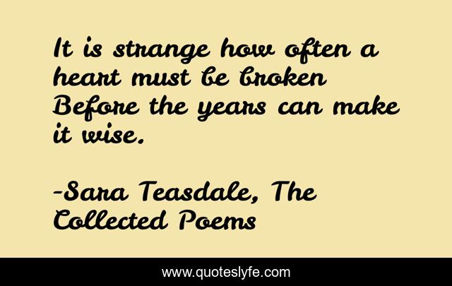This page presents the quote "It is strange how often a heart must be broken Before the years can make it wise.". Author of this quote is Sara Teasdale, The Collected Poems. This quote is about heart, heartbreak, poetry, wisdom,.