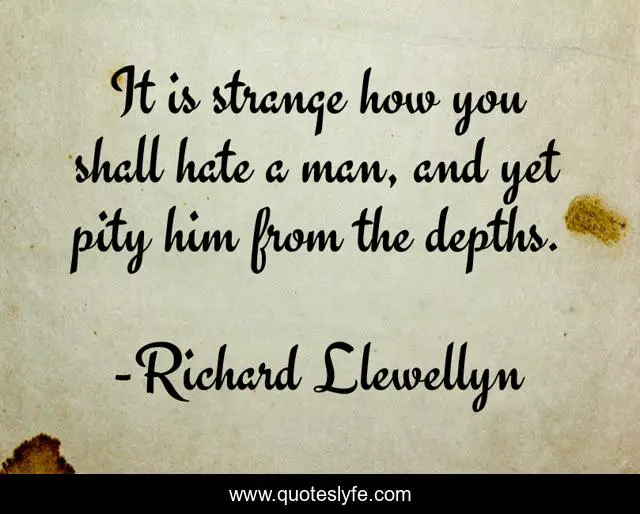 This page presents the quote "It is strange how you shall hate a man, and yet pity him from the depths.". Author of this quote is Richard Llewellyn. This quote is about pity, hatred, hate,.