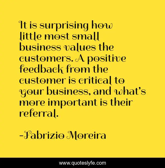 This page presents the quote "It is surprising how little most small business values the customers. A positive feedback from the customer is critical to your business, and what's more important is their referral.". Author of this quote is Fabrizio Moreira. This quote is about small, positive, confidence, feedback,.