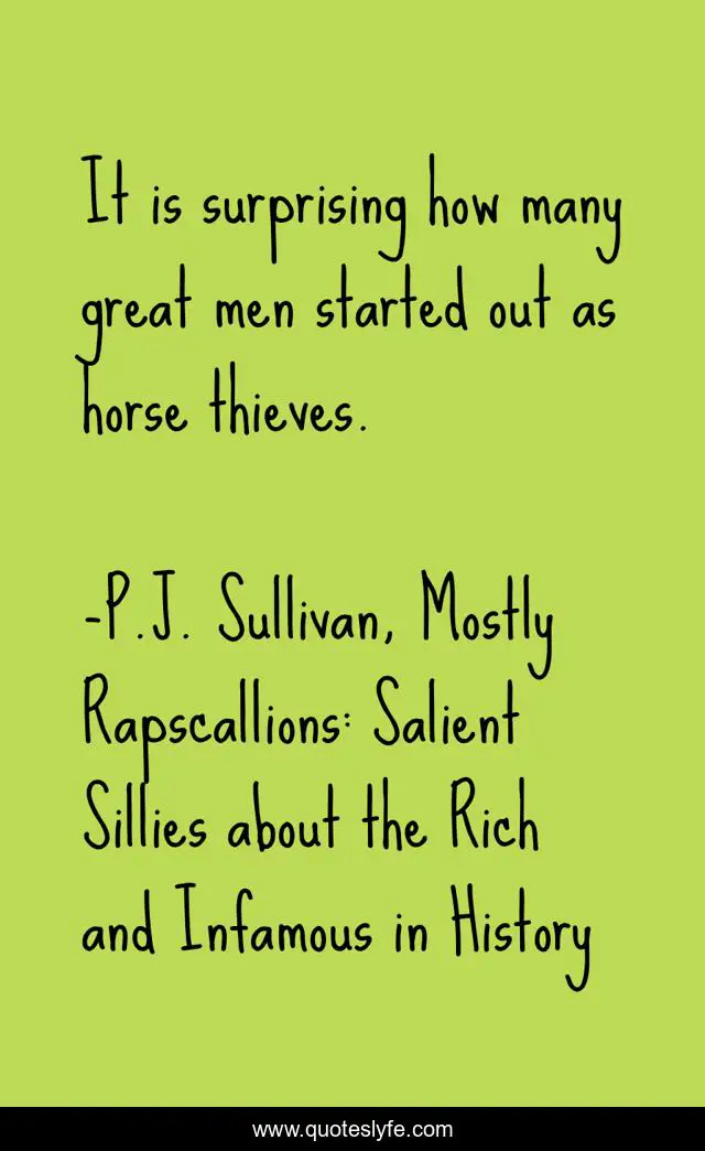 This page presents the quote "It is surprising how many great men started out as horse thieves.". Author of this quote is P.J. Sullivan, Mostly Rapscallions: Salient Sillies about the Rich and Infamous in History. This quote is about horses, great-men, greatness, historical, history,.