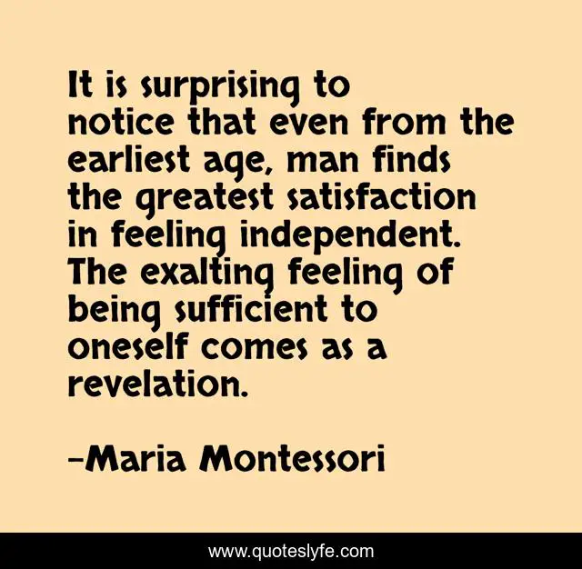 This page presents the quote "It is surprising to notice that even from the earliest age, man finds the greatest satisfaction in feeling independent. The exalting feeling of being sufficient to oneself comes as a revelation.". Author of this quote is Maria Montessori. This quote is about satisfaction, greatest, man,.