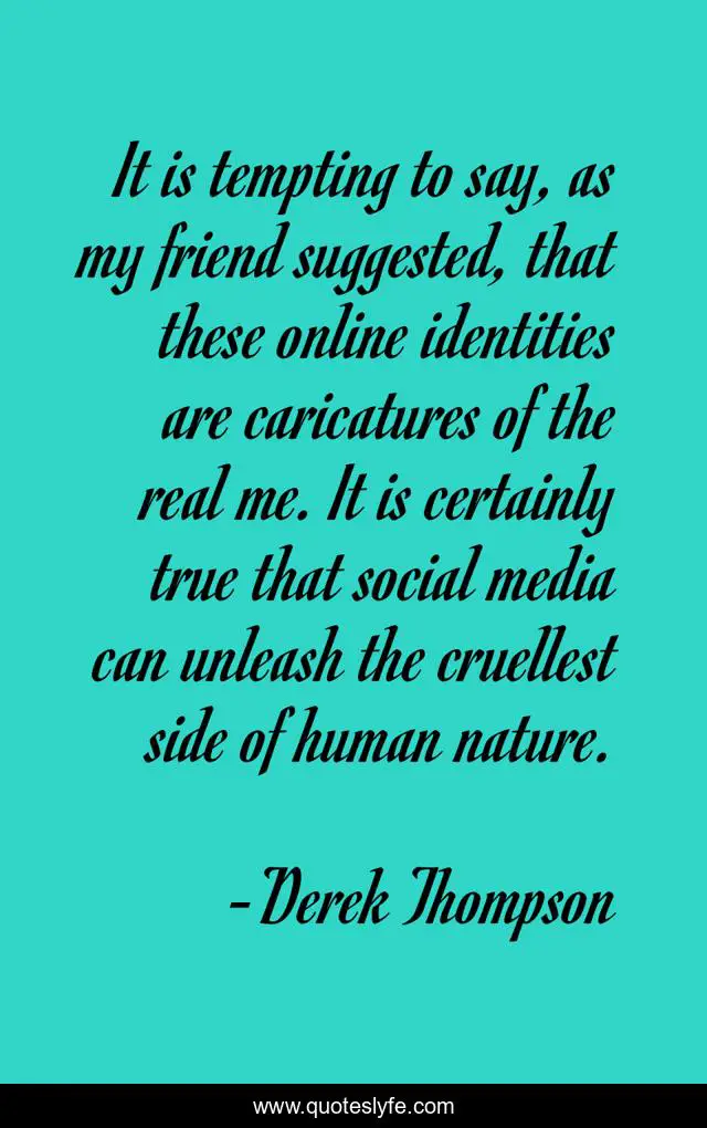 This page presents the quote "It is tempting to say, as my friend suggested, that these online identities are caricatures of the real me. It is certainly true that social media can unleash the cruellest side of human nature.". Author of this quote is Derek Thompson. .