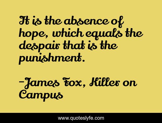This page presents the quote "It is the absence of hope, which equals the despair that is the punishment.". Author of this quote is James Fox, Killer on Campus. This quote is about reality, struggle, life-lessons, punishment,.