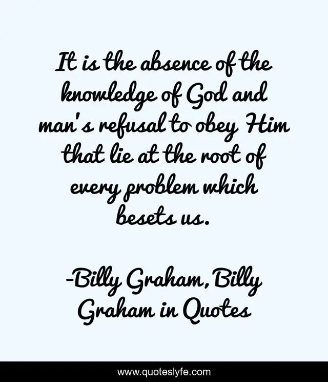 This page presents the quote "It is the absence of the knowledge of God and man’s refusal to obey Him that lie at the root of every problem which besets us.". Author of this quote is Billy Graham, Billy Graham in Quotes. This quote is about knowledge, billy-graham,.