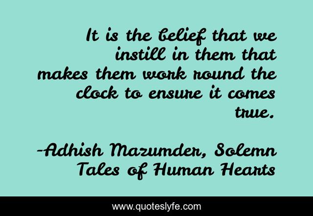 This page presents the quote "It is the belief that we instill in them that makes them work round the clock to ensure it comes true.". Author of this quote is Adhish Mazumder, Solemn Tales of Human Hearts. This quote is about adhish-mazumder, moral-stories-india, life, motivational, positive, work, confidence, witty, solemn-tales-of-human-hearts,.