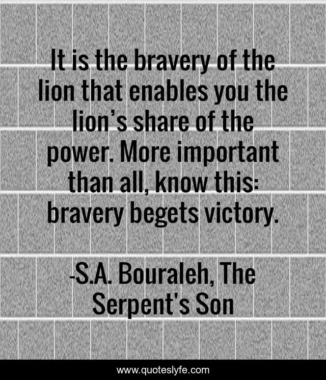 This page presents the quote "It is the bravery of the lion that enables you the lion’s share of the power. More important than all, know this: bravery begets victory.". Author of this quote is S.A. Bouraleh, The Serpent's Son. This quote is about brave, victory, bravery,.