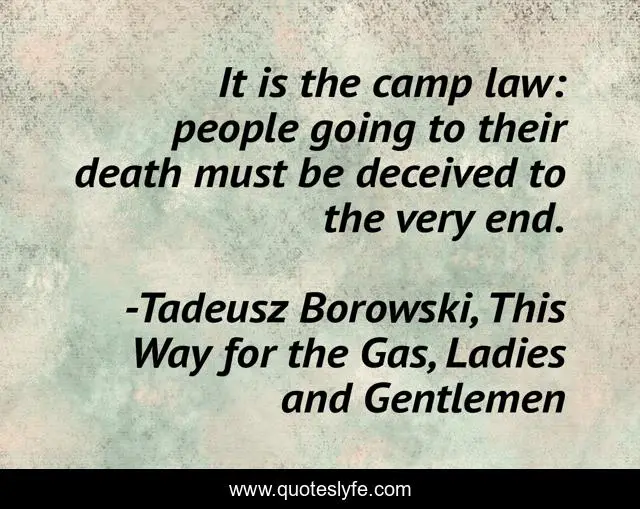 This page presents the quote "It is the camp law: people going to their death must be deceived to the very end.". Author of this quote is Tadeusz Borowski, This Way for the Gas, Ladies and Gentlemen. This quote is about death, deception, concentration-camp,.
