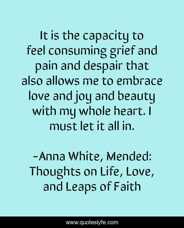 This page presents the quote "It is the capacity to feel consuming grief and pain and despair that also allows me to embrace love and joy and beauty with my whole heart. I must let it all in.". Author of this quote is Anna White, Mended: Thoughts on Life, Love, and Leaps of Faith. This quote is about whole-hearted, faith, love, beauty, personal-growth, joy, grieve, bereavement, grace,.
