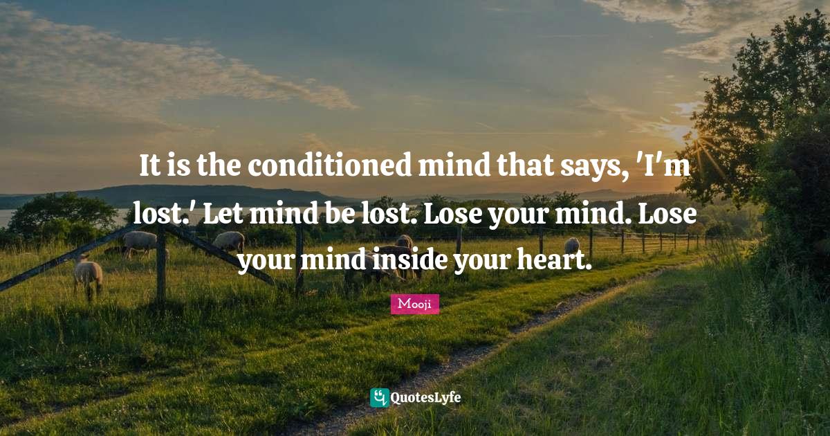 This page presents the quote "It is the conditioned mind that says, 'I'm lost.' Let mind be lost. Lose your mind. Lose your mind inside your heart.". Author of this quote is Mooji. This quote is about lost, mind, heart,.