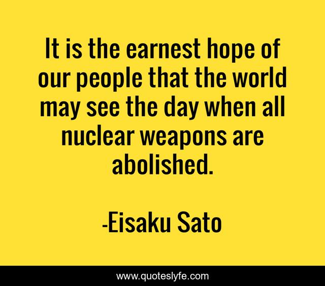 This page presents the quote "It is the earnest hope of our people that the world may see the day when all nuclear weapons are abolished.". Author of this quote is Eisaku Sato. This quote is about world, day, people,.