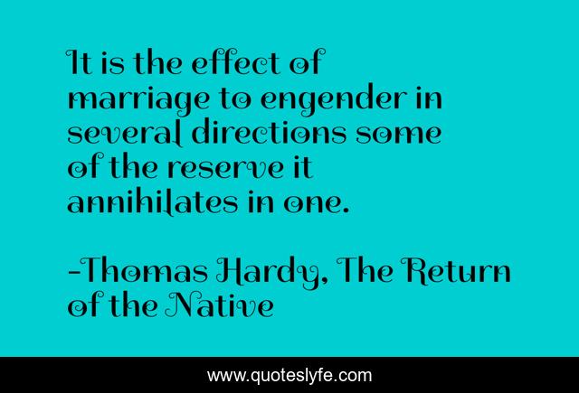 This page presents the quote "It is the effect of marriage to engender in several directions some of the reserve it annihilates in one.". Author of this quote is Thomas Hardy, The Return of the Native. .