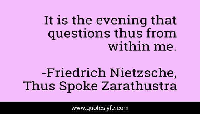 This page presents the quote "It is the evening that questions thus from within me.". Author of this quote is Friedrich Nietzsche, Thus Spoke Zarathustra. This quote is about life-lesson, evening,.
