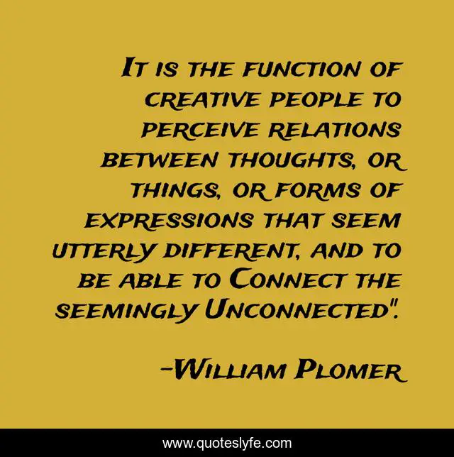 This page presents the quote "It is the function of creative people to perceive relations between thoughts, or things, or forms of expressions that seem utterly different, and to be able to Connect the seemingly Unconnected".". Author of this quote is William Plomer. This quote is about people, relations, creative, connect, unconnected, thoughts,.