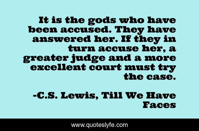 This page presents the quote "It is the gods who have been accused. They have answered her. If they in turn accuse her, a greater judge and a more excellent court must try the case.". Author of this quote is C.S. Lewis, Till We Have Faces. .