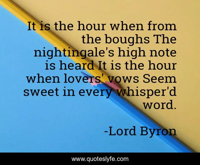 This page presents the quote "It is the hour when from the boughs The nightingale's high note is heard It is the hour when lovers' vows Seem sweet in every whisper'd word.". Author of this quote is Lord Byron. .