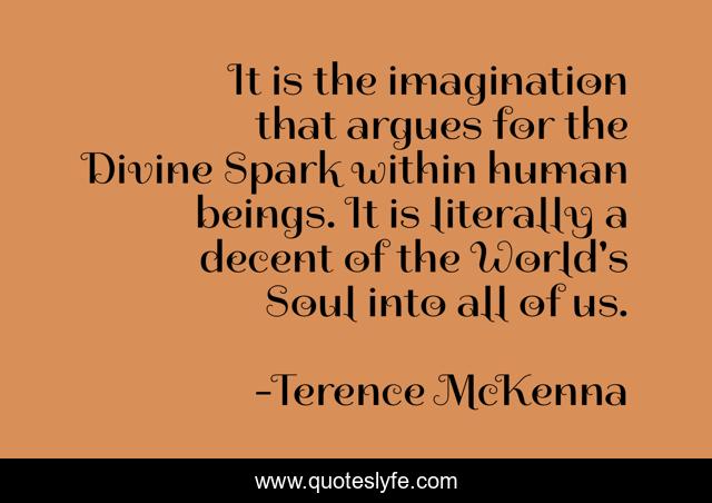 This page presents the quote "It is the imagination that argues for the Divine Spark within human beings. It is literally a decent of the World's Soul into all of us.". Author of this quote is Terence McKenna. This quote is about imagination, divine, soul, human, world,.