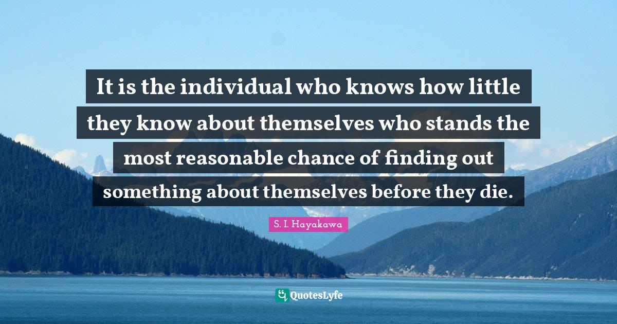 This page presents the quote "It is the individual who knows how little they know about themselves who stands the most reasonable chance of finding out something about themselves before they die.". Author of this quote is S. I. Hayakawa. This quote is about finding yourself, reasonable, individual, littles, knows, chance,.