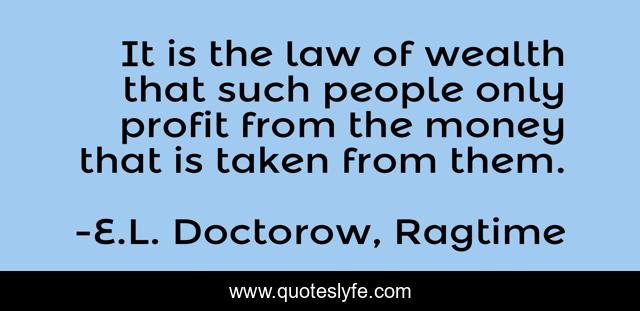This page presents the quote "It is the law of wealth that such people only profit from the money that is taken from them.". Author of this quote is E.L. Doctorow, Ragtime. This quote is about money, wealth,.
