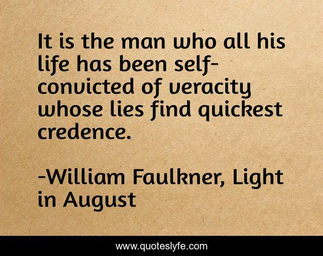 This page presents the quote "It is the man who all his life has been self-convicted of veracity whose lies find quickest credence.". Author of this quote is William Faulkner, Light in August. .