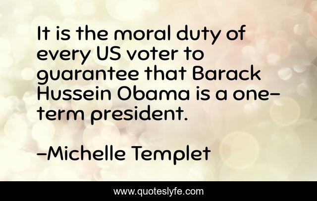 This page presents the quote "It is the moral duty of every US voter to guarantee that Barack Hussein Obama is a one-term president.". Author of this quote is Michelle Templet. This quote is about politics, barack-obama, voting,.