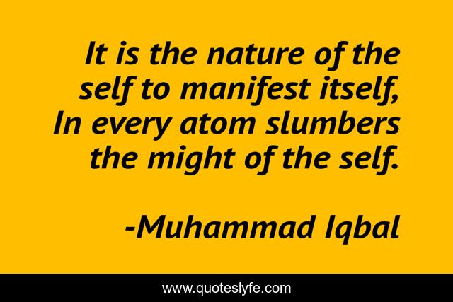 This page presents the quote "It is the nature of the self to manifest itself, In every atom slumbers the might of the self.". Author of this quote is Muhammad Iqbal. This quote is about self, manifest,.