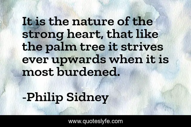 This page presents the quote "It is the nature of the strong heart, that like the palm tree it strives ever upwards when it is most burdened.". Author of this quote is Philip Sidney. This quote is about heart, strong, tree,.